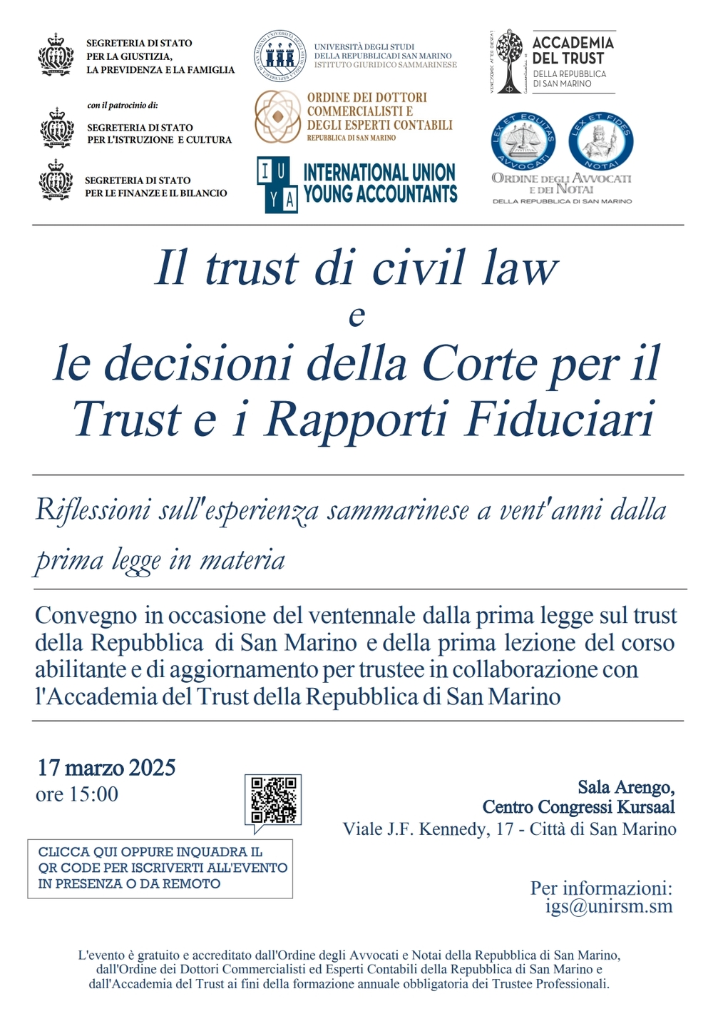 Convegno "IL TRUST DI CIVIL LAW E LE DECISIONI DELLA CORTE PER IL TRUST E I RAPPORTI FIDUCIARI"Riflessioni sull'esperienza sammarinese a vent'anni dalla prima legge in materia.17 marzo 2025.