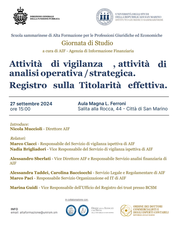 Convegno"ATTIVITA' DI VIGILANZA, ATTIVITA' DI ANALISI OPERATIVA/STRATEGICA. REGISTRO SULLA TITOLARITA' EFFETTIVA"20 e 27 settembre 2024