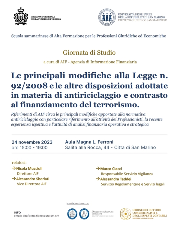 Riferimenti di AIF circa le principali modifiche apportate alla normativa antiriciclaggio con particolare riferimento all'attività dei professionisti, la recente esperienza ispettiva e l'attività di analisi finanziaria operativa e strategica.