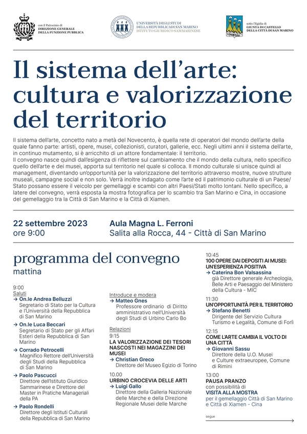 Il convegno nasce quindi dall’esigenza di riflettere sul cambiamento che il mondo della cultura, nello specifico quello dell’arte e dei musei, apporta sul territorio nel quale si colloca. Il mondo culturale si unisce quindi al management, diventando un’opportunità per la valorizzazione del territorio attraverso mostre, nuove strutture museali, campagne social e non solo. Verrà inoltre indagato come l’arte ed il patrimonio culturale di un Paese/Stato possano essere il veicolo per gemellaggi e scambi con altri Paesi/Stati molto lontani. Nello specifico, a latere del convegno, verrà esposta la mostra fotografica per lo scambio tra San Marino e Cina, in occasione del gemellaggio tra la Città di San Marino e la Città di Xiamen.