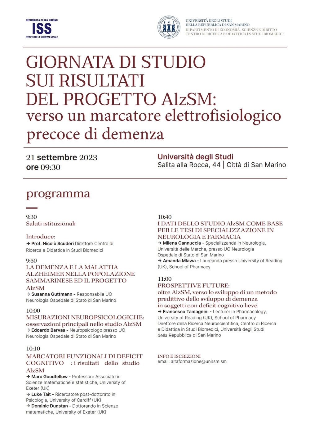 Giornata di studio suiRISULTATI DEL PROGETTO AlzSM: verso un marcatore elettrofisiologico precoce di demenza21 settembre 2023